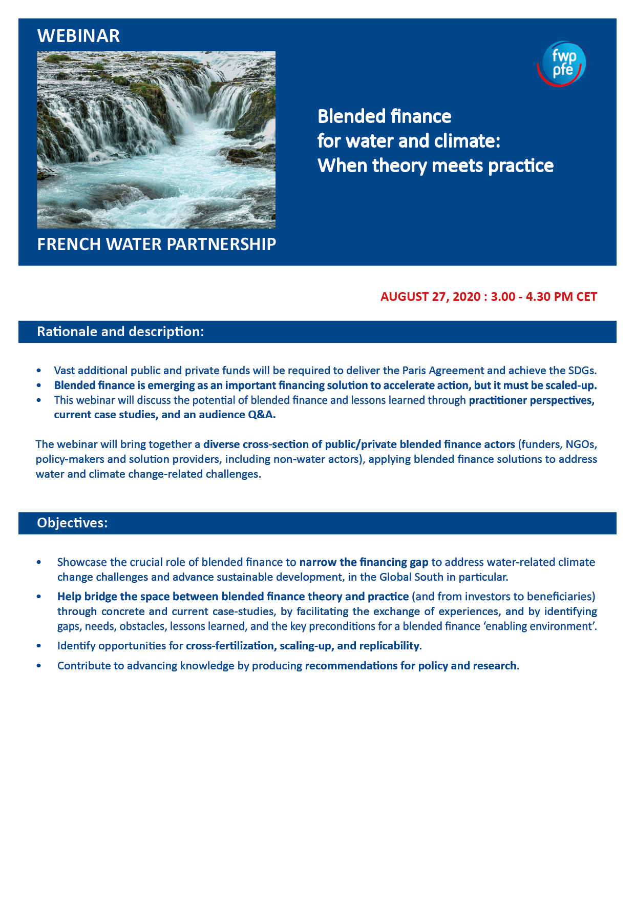 The French Water Partnership organized on August 27, 2020 a webinar on ‘Blended finance for water and climate: when theory meets practice’ .