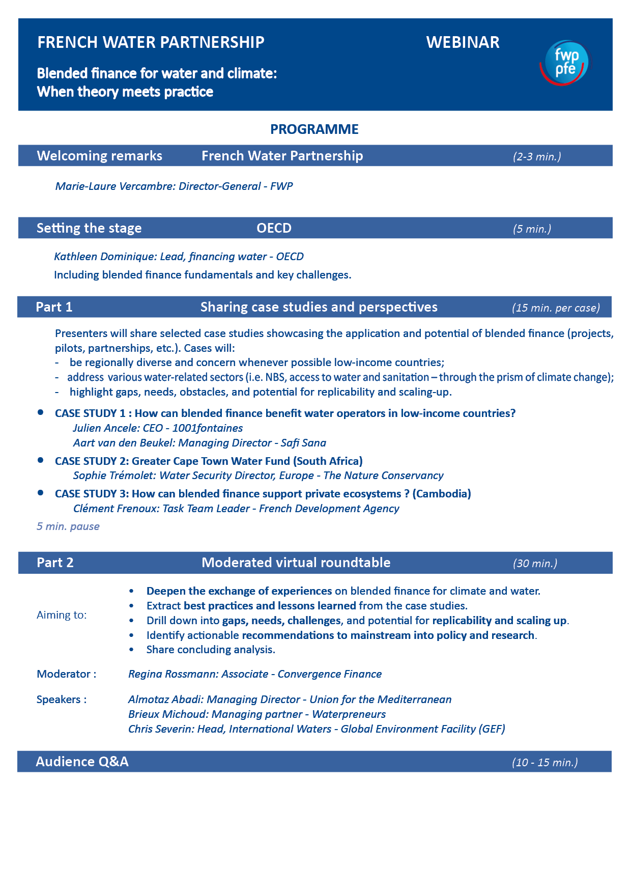 This webconference brought together a diverse cross-section of public and private actors applying blended finance solutions to address water and climate change-related challenges. Experts and practitioners from OECD, 1001fontaines, Safi Sana, The Nature Conservancy, the French Development Agency, Convergence Finance, the Union for the Mediterranean, Waterpreneurs, and Global Environment Facility (GEF) discussed the potential of blended finance and lessons learned through three current case studies, a moderated virtual roundtable, and an audience Q&A.